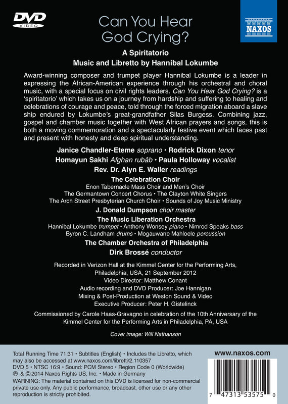 Hannibal Lokumbe CAN YOU HEAR GOD CRYING? A Spiritatorio Janice Chandler-Eteme, soprano Rodrick Dixon, tenor Paula Holloway, vocals Homayun Sakhi, rubâb Alyn...
