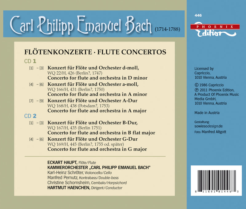 On SalePhoenix EditionC.P.E. Bach: Flute Concertos / Haupt, Haenchen, C.P.E. Bah Chamber OrchestraThis two-disc release from 2011 features C.P.E. Bach Flute Concertos performed by Eckart Haupt. 15 works in all.