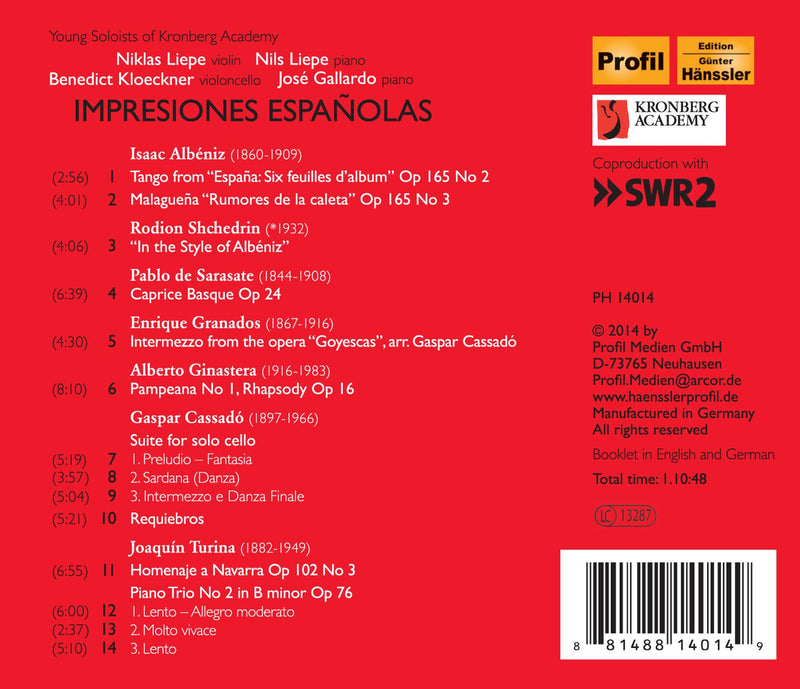 •Spanish Impressions features the works of Albéniz, Shchedrin, Sarasate, Granados, Ginastera, Cassadó and Turina performed by the Young Soloists of Kronberg Academy;...