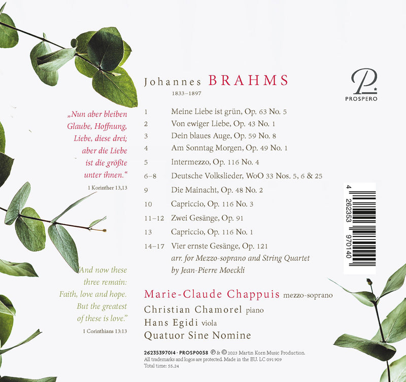 Prospero ClassicalBrahms: Vier Ernste Gesange / Chappuis, Chamorel, Quartet Sin Nomine