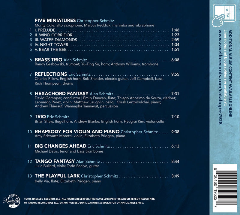 Ravello RecordsAce Composers: 21st Century Chamber MusicThis new release features compositions by a true musical family: Alan Schmitz and his two sons, Christopher and Eric. Alan Schmitz currently...