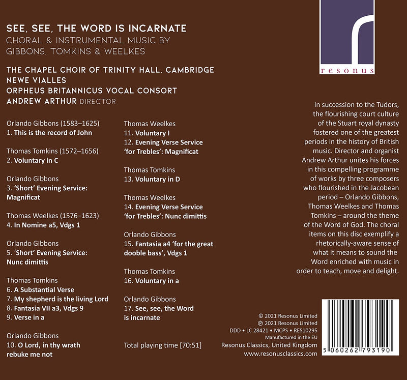 On SaleResonus ClassicsSee, See, The Word is Incarnate: Choral & Instrumental Music by Gibbons, Tomkins, & Weelkes
