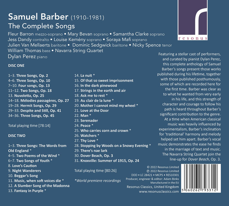 Featuring a stellar cast of performers, and curated by pianist Dylan Perez, this complete anthology of Samuel Barber's songs present those works...