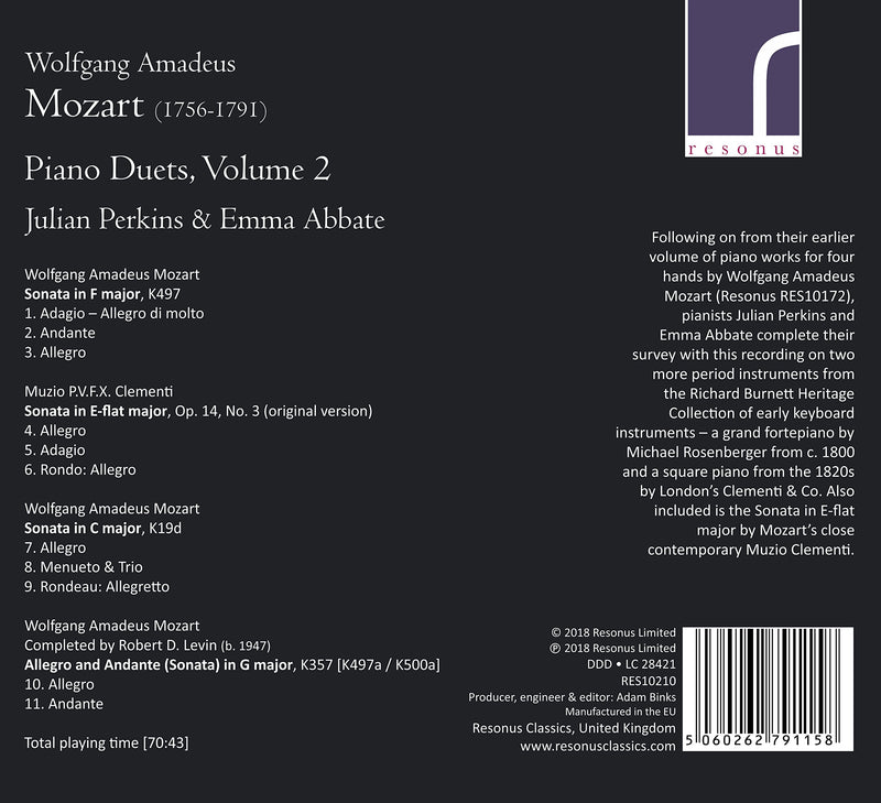 Following on from their earlier volume of piano works for four hands by Wolfgang Amadeus Mozart, pianists Julian Perkins and Emma Abbate...