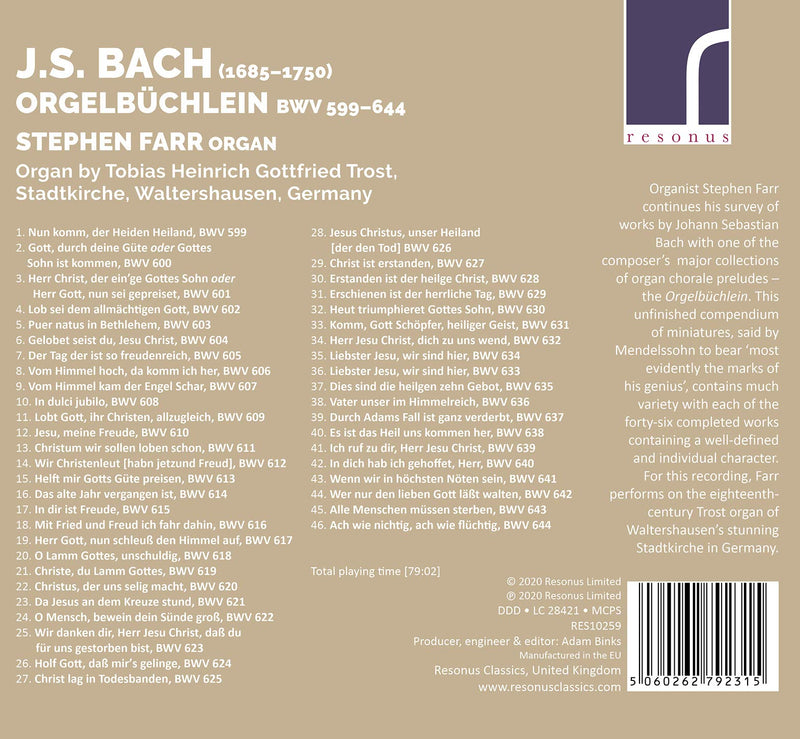 Organist Stephen Farr continues his survey of works by Johann Sebastian Bach with one of the composer's major collections of organ chorale...