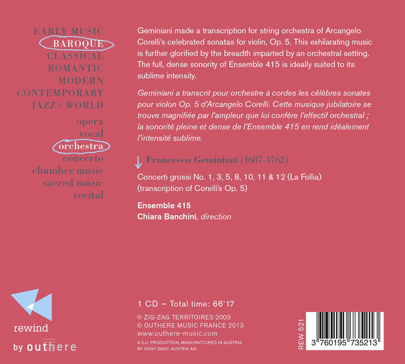 RewindFrancesco Germiniani: Concerti Grossi & La FolliaVirtuoso baroque-era violinist Francesco Geminiani (1687-1762) transcribed for string orchestra Arcangelo Corelli’s celebrated sonatas for violin, op. 5. One of the finest...