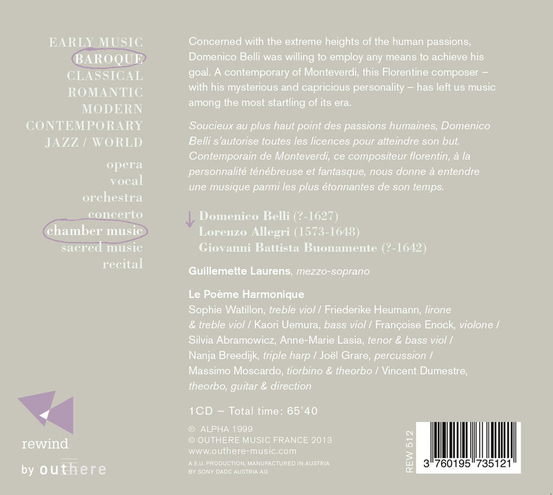 RewindBelli: Il Nuovo StileWorks of Lorenzo Allegri (1573-1648) and Giovanni Battista Buonamente (d. 1642)] intersperse the music of Monteverdi coeval Domenico Belli d. 1627), a...