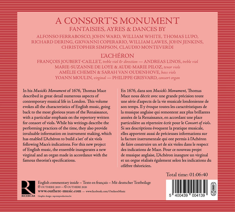 RicercarA Consort's Monument / Joubert-Caillet, L'AcheronIn his Musick’s Monument of 1676, Thomas Mace described in great detail numerous aspects of contemporary musical life in London. This volume...