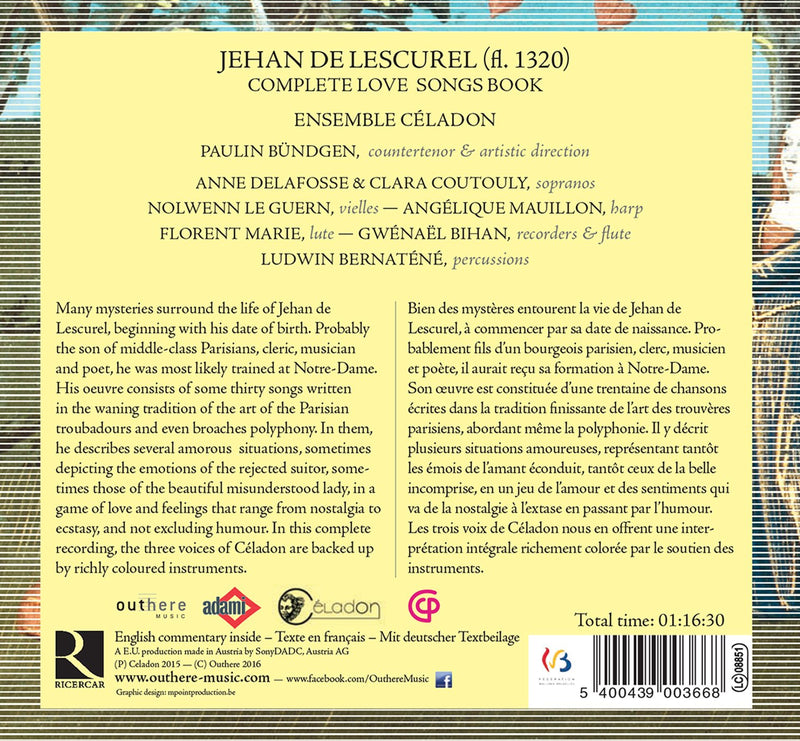 RicercarThe Love Songs of Jehan de LescurelLittle is known of composer Jehan de Lescurel. Most likely trained at Notre-Dame, he wrote around thirty pieces composed in the style...