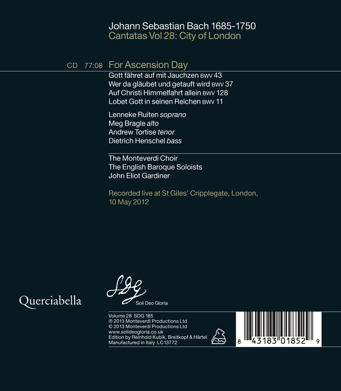 Recorded in the City of London in 2012, this album features the missing cantatas from the Bach Cantata Pilgrimage: the Ascension Cantatas were the only ones left unrecorded in 2000, due to noise issues. They were recorded live at St Giles Cripplegate (one of our original Pilgrimage venues) in two concerts entirely funded by the generosity of hundred of donors across the world, following a heartfelt appeal from comedian Alexander Armstrong. The quartet of soloists include one of the original Pilgrimage soloists, bass Dietrich Henschel, alongside a new generation of Bach interpreters who have worked with the ensembles since 2000 – making this recording a "bridge" between a Bach tradition started 13 years ago and today. - The Monteverdi Choir