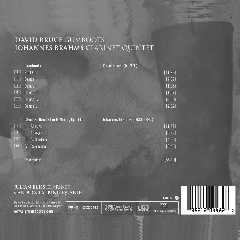 The two works on this release are highly contrasting- Johannes Brahms’s Clarinet Quintet and David Bruce’s Gumboots. David Bruce describes his inspiration...