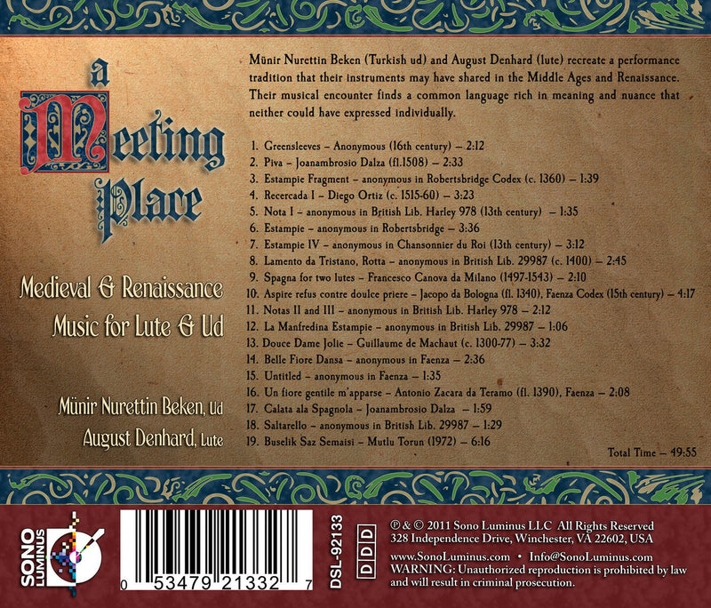 Sono LuminusA Meeting Place - Medieval & Renaissance Music For Lute & Ud / Denhard, BekenDelicious and subtle, atmospheric and communicative. I have learned a great deal about the ud in recent years since becoming a member...