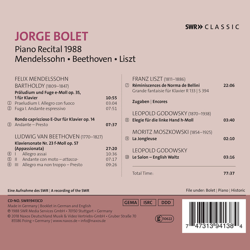 This is a live recording of a piano recital the great virtuoso Jorge Bolet gave 1988, in Schwetzingen (Germany), two years before...