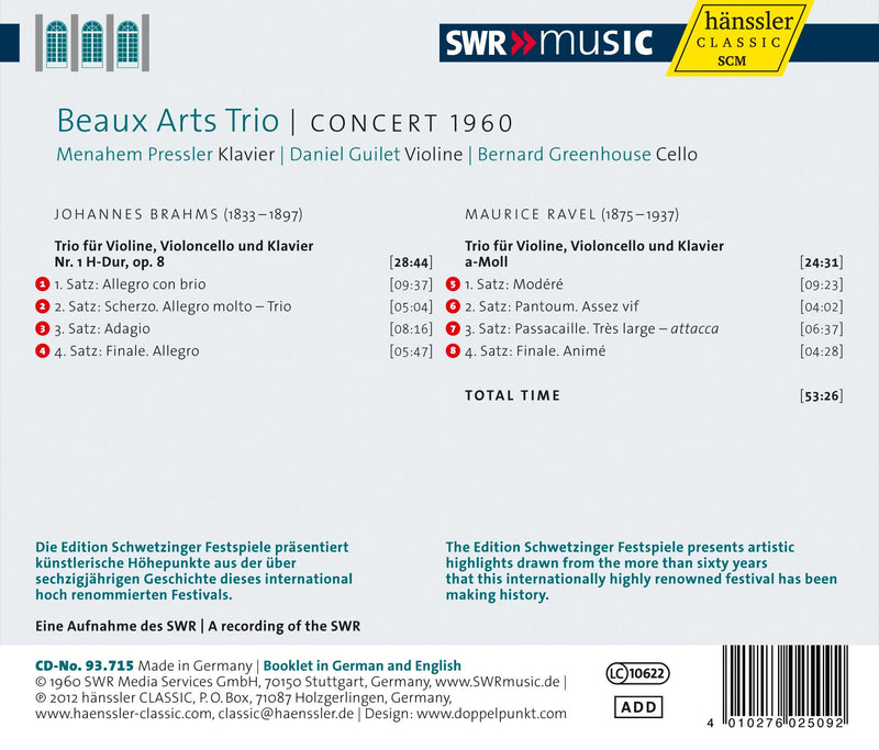 SWRBeaux Arts Trio: Concert 1960 - Maurice Ravel, Johannes Brahms