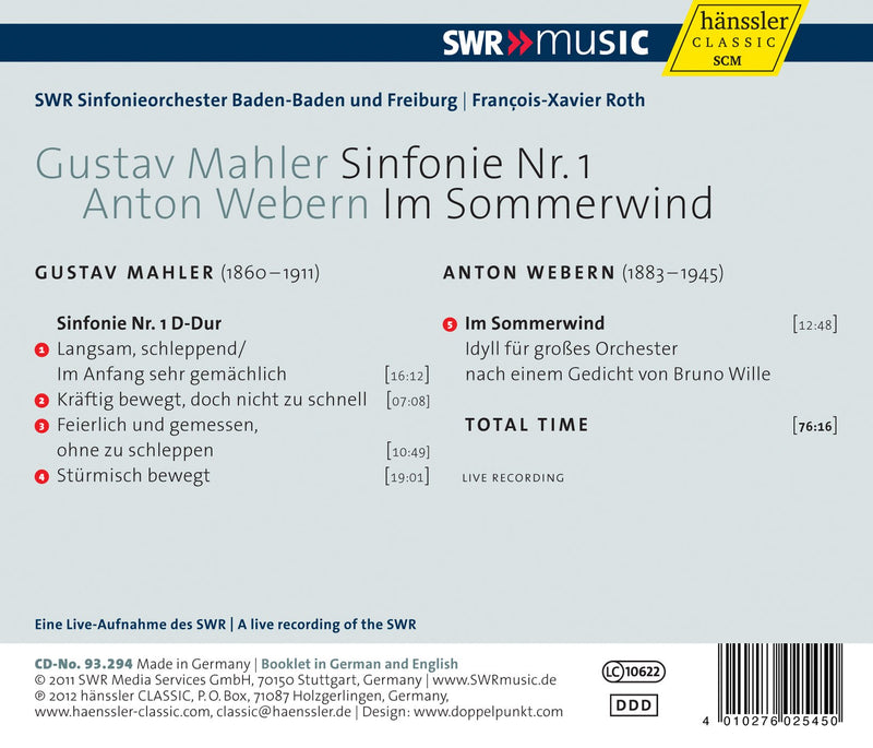 SWRMahler: Symphony No. 1. - Webern: Im SommerwindIntroducing François-Xavier Roth - the charismatic new Principal Conductor of the SWR Sinfonieorchester Baden-Baden and Freiburg in his debut recording as part...