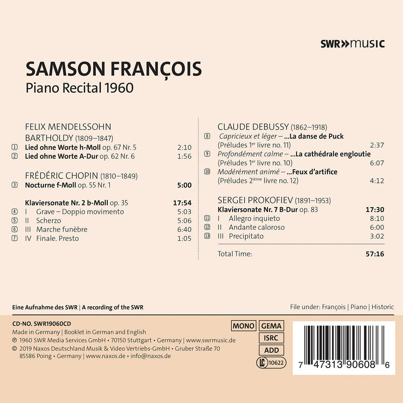 SWRPiano Recital 1960Samson Francois was considered an enfant terrible, eccentric and flamboyant; his life and demeanor were rather provocative and subjectivist. This release offers...