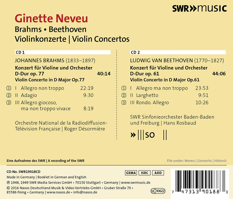 This album showcases one of Ginette Neveu's last recordings of Beethoven's concerto, recorded only weeks before her death. The Brahms Concerto was...