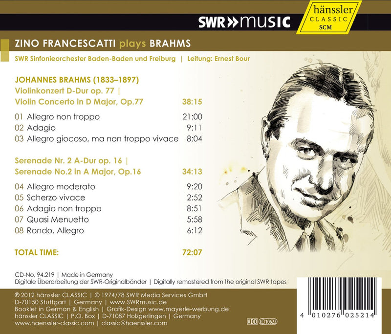 BRAHMS Violin Concerto. Serenade No. 2 in A • Ernest Bour, cond; Zino Francescatti (vn); SWR SO Baden-Baden and Freiburg • HÄNSSLER...