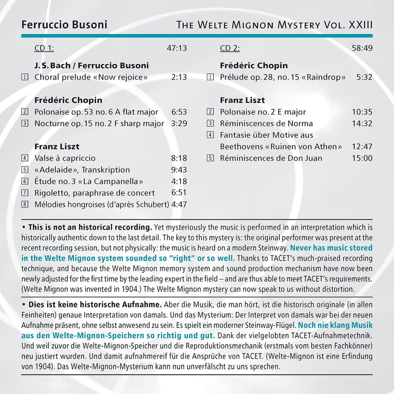 TACET MusikproduktionThe Welte Mignon Mystery Vol. 23 / Busoni