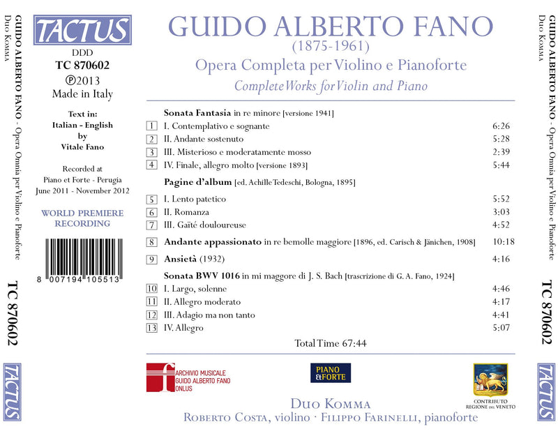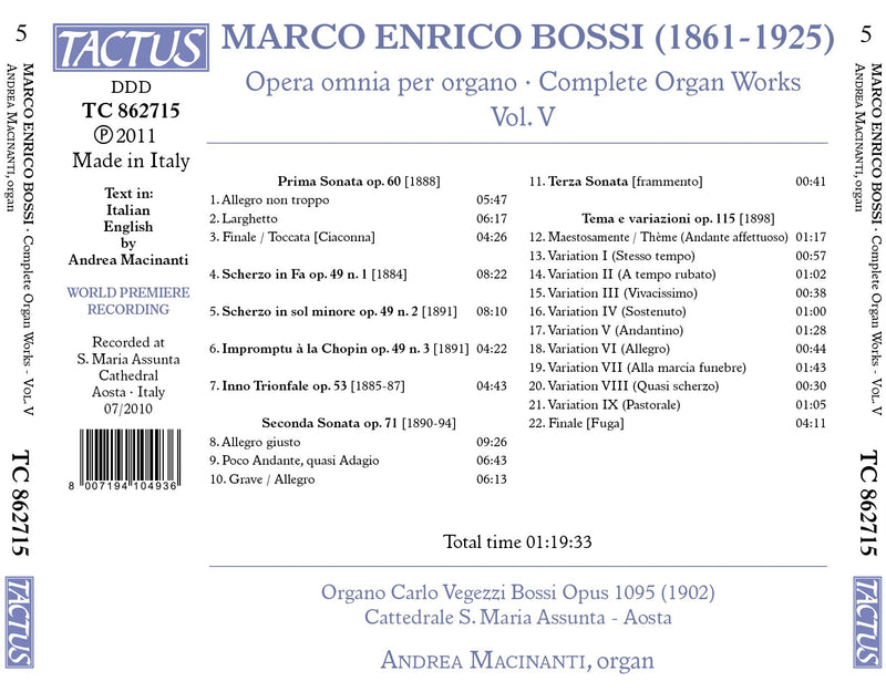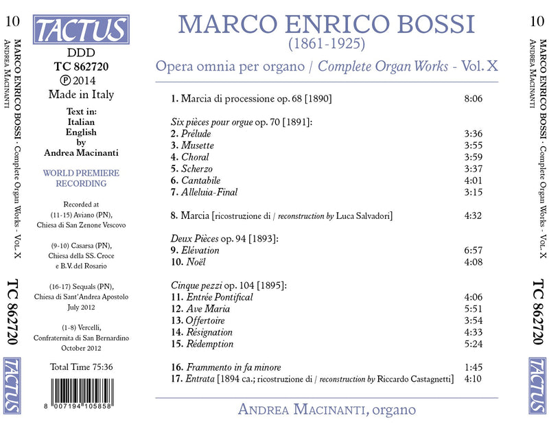 Performer, composer and teacher Marco Enrico Bossi (1861-1925) was the first internationally famous Italian concert artist. + He was conferred the highest...