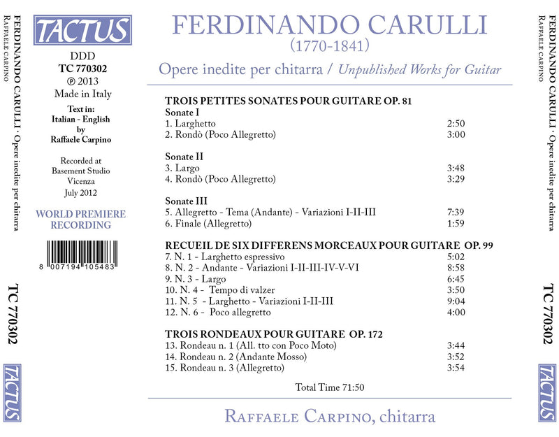 • World premiere recordings! • For this recording, guitarist Raffaele Carpino used the first printed editions from the 19thcentury, and deliberately performed...