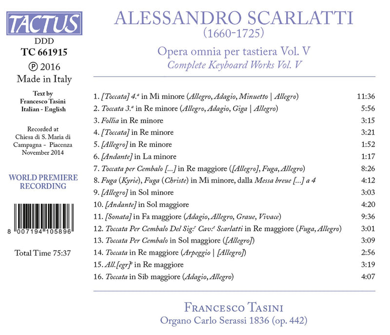 This is the fifth volume of Alessandro Scarlatti's complete works for keybaord series. Francesco Tasini plays the 1836 organ, located in the...