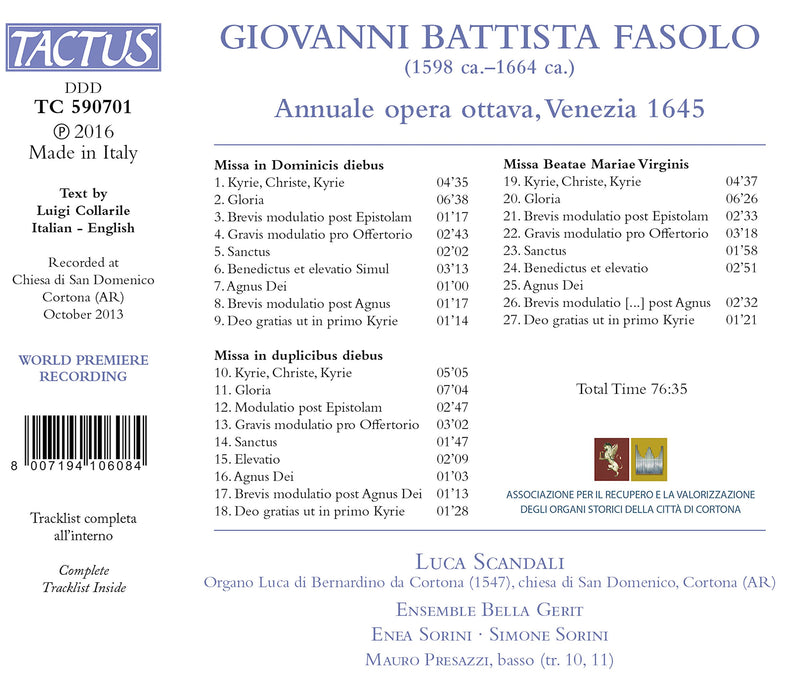 Giovanni Battista Fasolo most probably composed its Annuale simultaneously to the famous "Fiori Musicali" by Girolamo Frescobaldi; the Annual, however, was delivered...