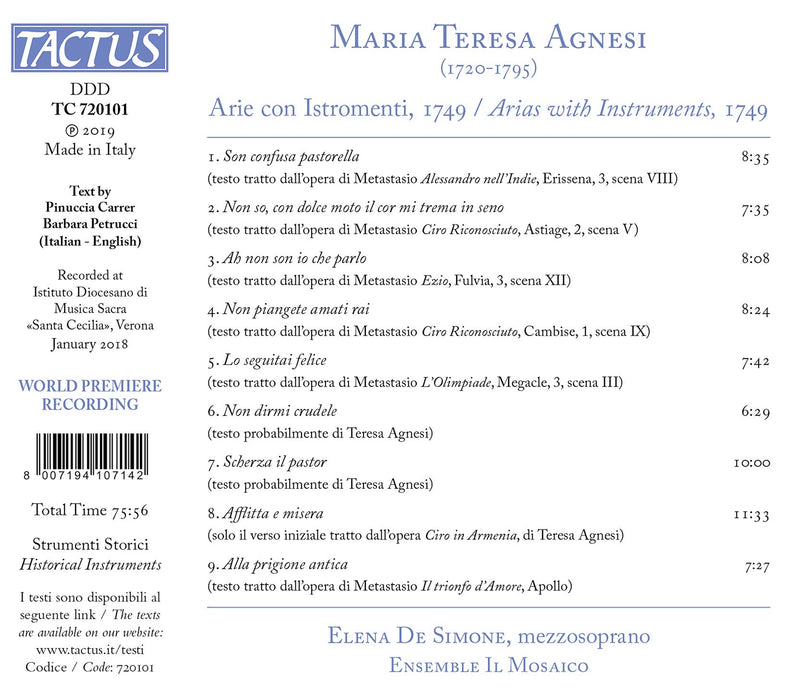 TactusAgnesi: Arie con Istromenti, 1749 / De Simone, Ensemble Il Mosaico