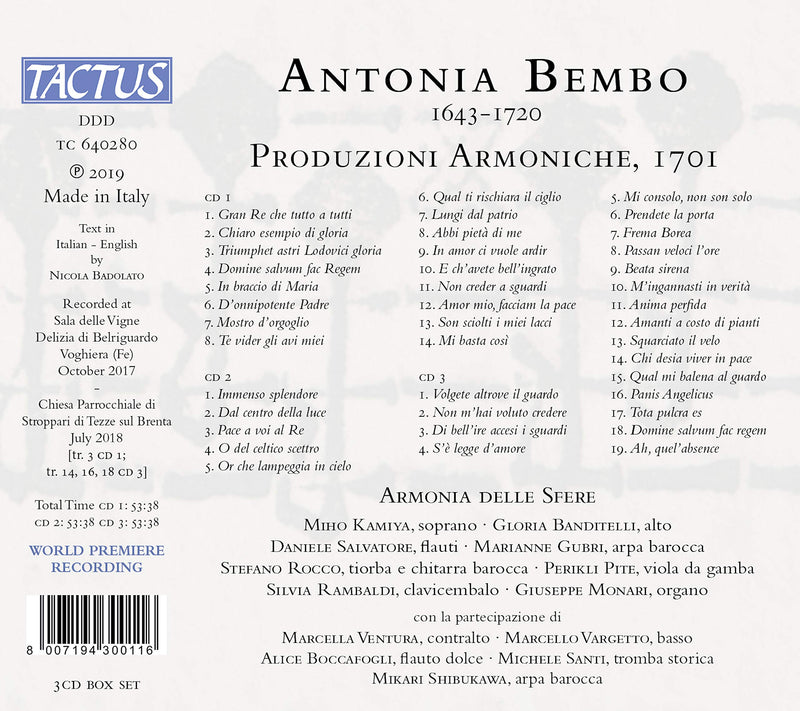 Within this new album the Armonia delle Sfere ensemble is delivering to us the complete Produzioni Armoniche work by Antonia Bembo, a...