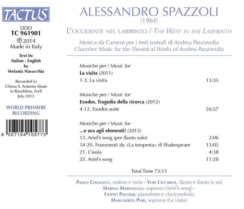 •Alessandro Spazzoli’s work has no descriptive purpose and does not want to create any correspondencebetween motifs and chords, emotions and concepts. Deeperstill...