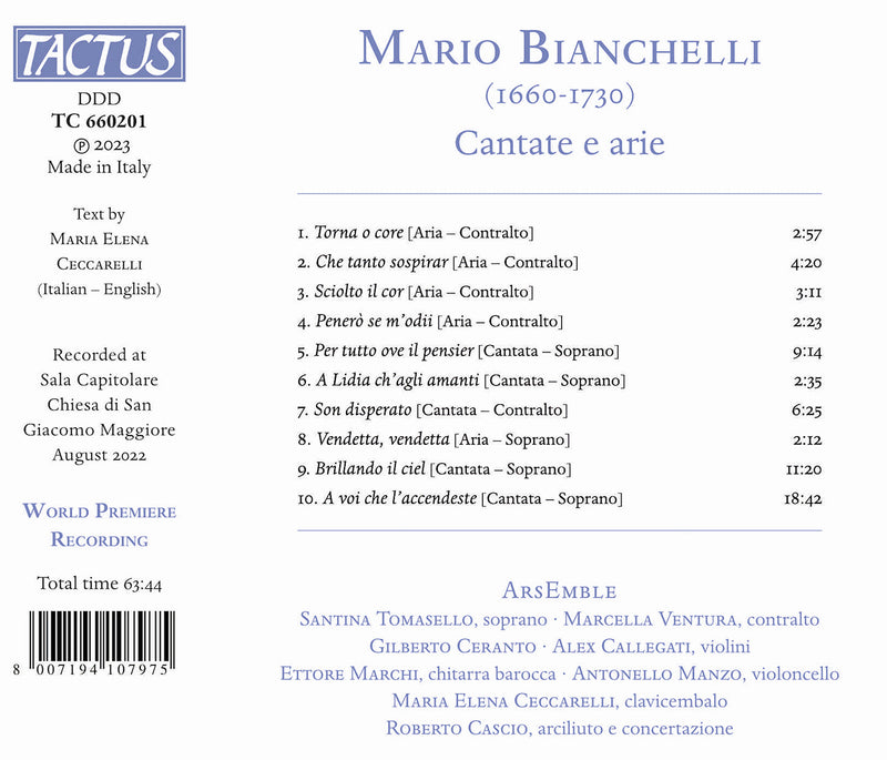 This world premiere recording by ArsEmble is focused on the rediscovery of the seventeenth-century composer from Rimini, Mario Bianchelli, an amateur instrumentalist...