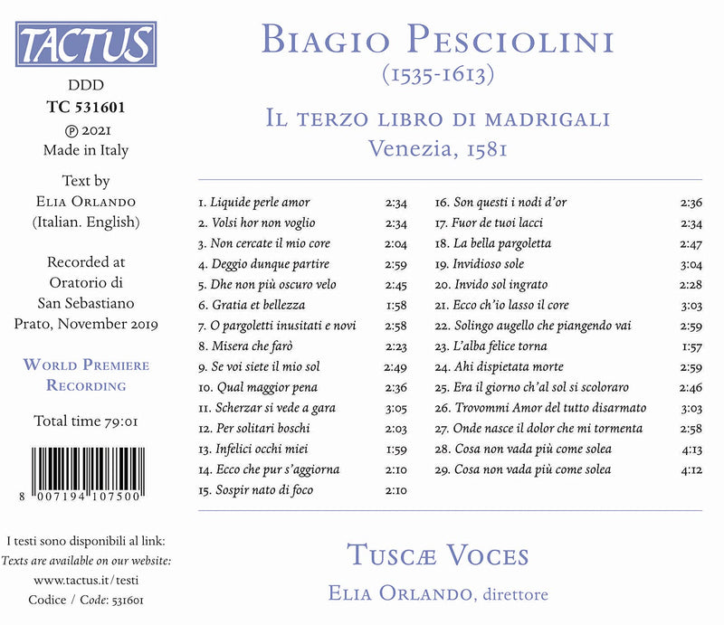 The recording of the third book of madrigals by Biagio Pesciolini, from Prato, is the outcome of a research on the figure...