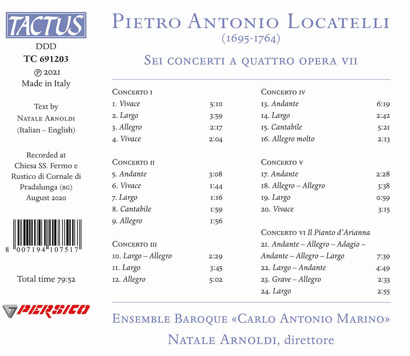 TactusLocatelli: Sei Concerti a Quattro Opera VII / Arnoldi, Ensemble Barocco Carlo Antonio Marino