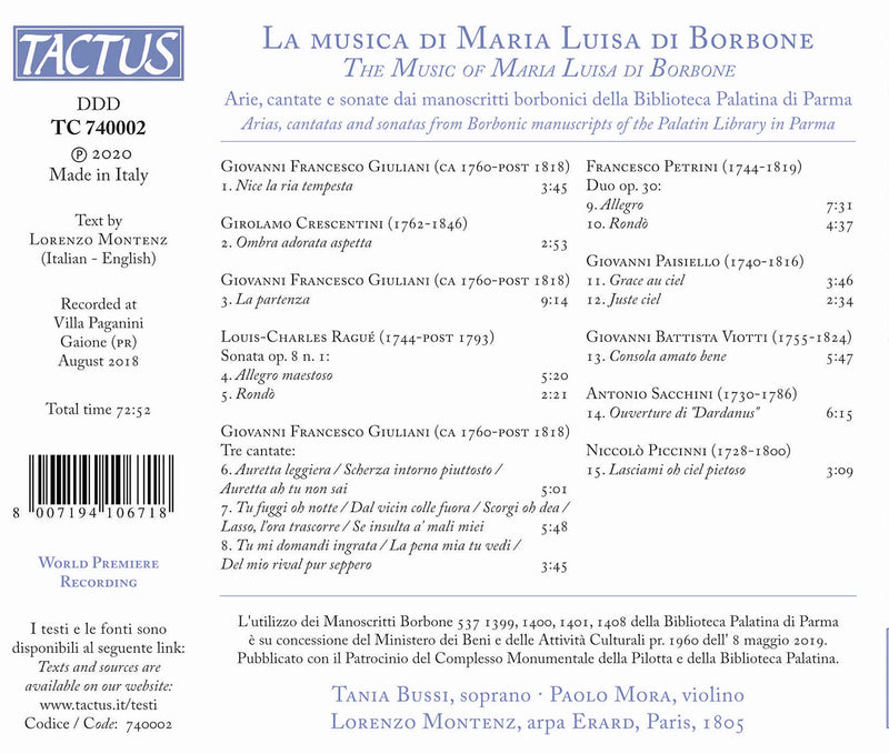 The research work behind this album is based on music of Maria Luisa of Borbone found in Parma at the Biblioteca Palatina....