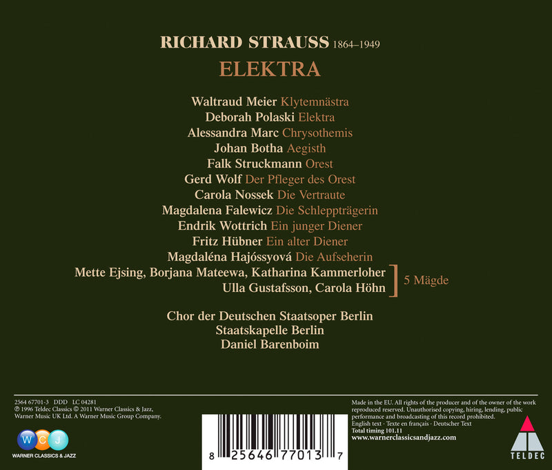 On SaleTeldecELEKTRAR. Strauss - Elektra, Chor der Deutschen, Staatsoper Berlin and Saatskapelle Berlin directed by Daniel Barenboim.