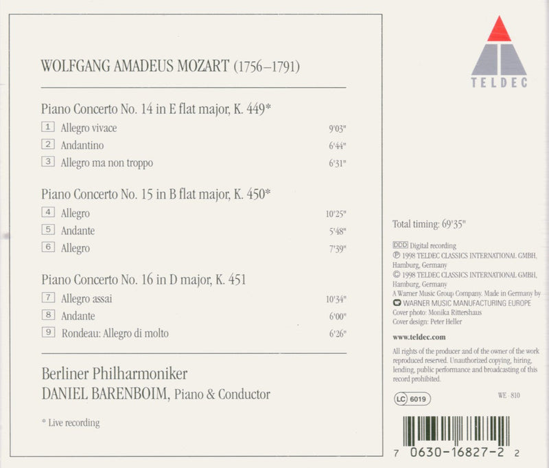 On SaleTeldecPIANO CONCERTOS NOS 14, 15 & 1Daniel Barenboim continues his acclaimed Mozart concerto cycle with the Berlin Philharmonic, widely acknowledged among the greatest orchestras in the world. Barenboim,...