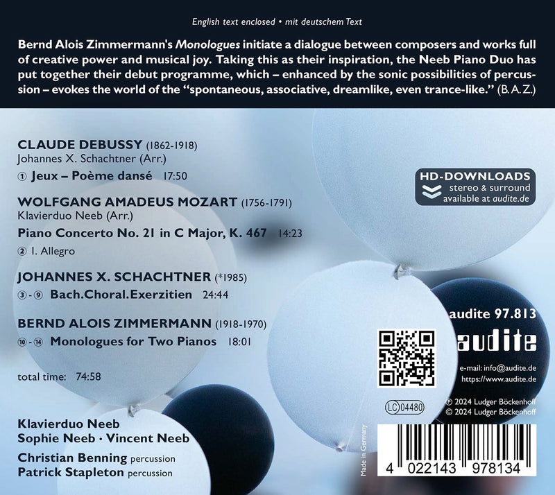 Audite MusikproduktionDebussy, Mozart, Schachtner & Zimmermann: Dialogues across Time / Neeb Piano Duo