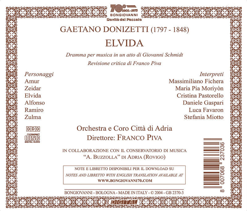A one-act opera, Elvida is a short “dramatic action” which in effect “has nothing historical”, as is stated in the libretto’s “topic”,...