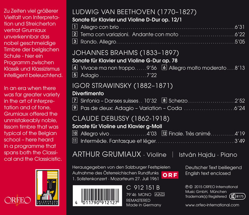 On SaleOrfeoBeethoven: Sonate D-dur Op. 12/1; Brahms: Sonate G-dur Op. 79; Strawinsky: Divertimento; Debussy: Sonate G-moll