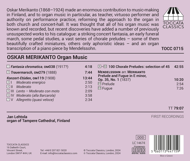 Oskar Merikanto (1868–1924) made an enormous contribution to music-making in Finland, and to organ music in particular, as teacher, virtuoso performer and...