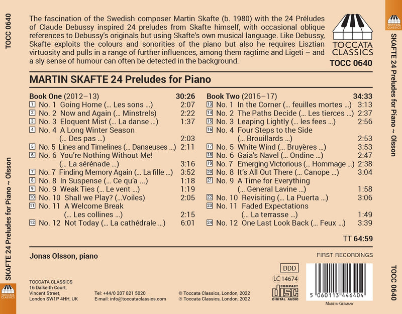 The fascination of the Swedish composer Martin Skafte (b. 1980) with the 24 Préludes of Claude Debussy inspired 24 preludes from Skafte...