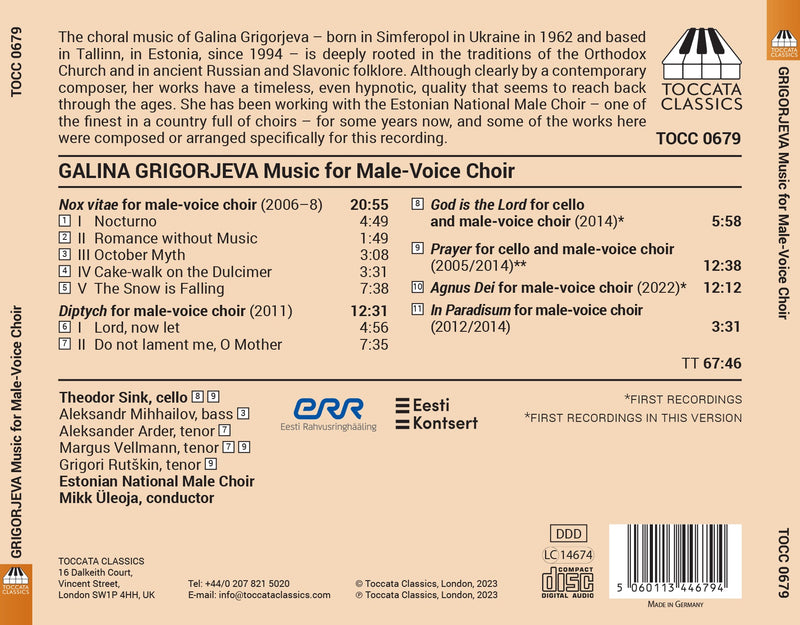 ToccataGrigorjeva: Music for Male-Voice Choir / Üleoja, Estonian National Male Choir