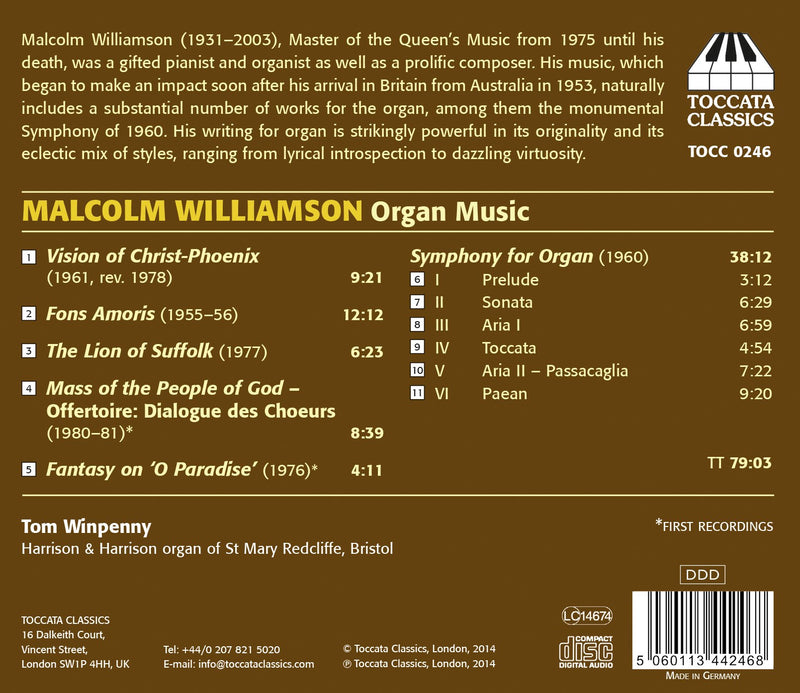 On SaleToccataMalcolm Williamson: Organ Music - Symphony; Vision Of Christ-phoenix; Fantasy On "o Paradiese"; The Lion Of Suffolk; Fons Amoris; Offertoire