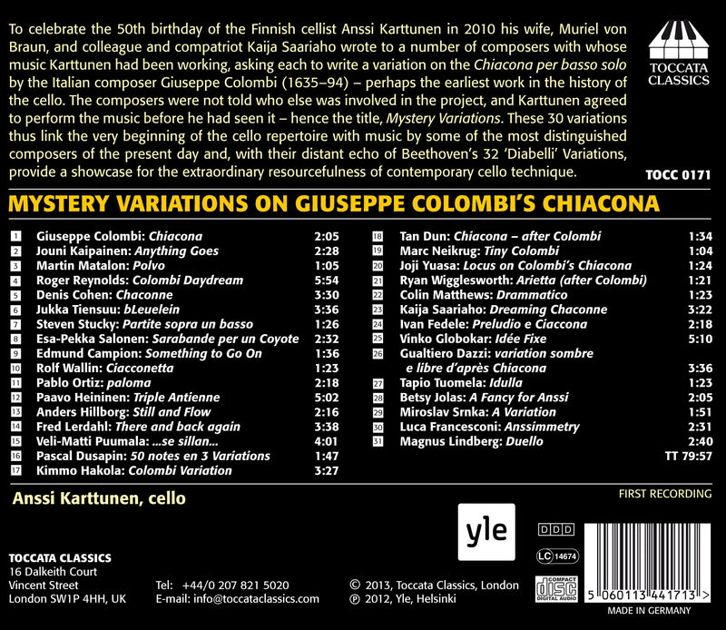 MYSTERY VARIATIONS ON GIUSEPPE COLOMBI’S CHIACONA • Anssi Karttunen (vc) • TOCCATA 0171 (79:57) COLOMBI Chiacona. KAIPAINEN Anything Goes. MATALON Polvo. REYNOLDS...