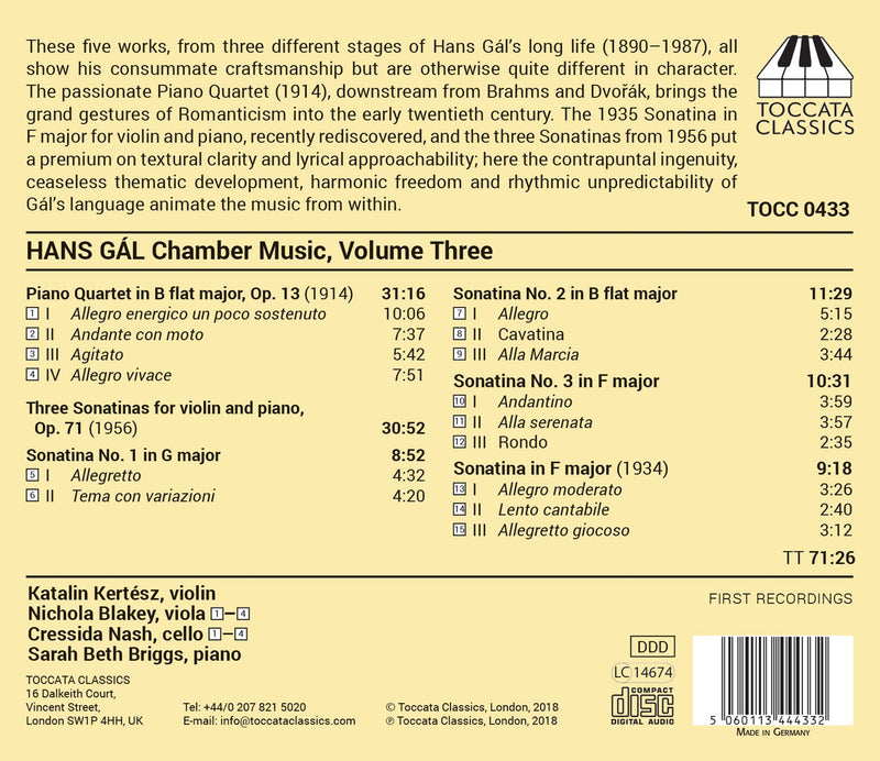 GÁL Solo Cello Sonata. Solo Cello Suite. Cello and Piano Sonata • Alfia Nakipbekova (vc); Jakob Fichert (pn) • TOCCATA TOCC0043 (61:95)...