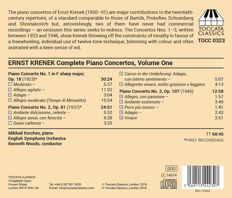ToccataKrenek: Complete Piano Concertos, Vol. 1 / Korzhev, Woods, English Symphony