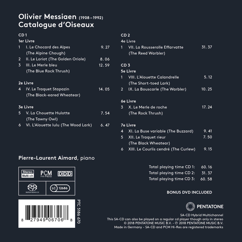 Pierre-Laurent Aimard’s long association with Olivier Messiaen’s music dates back to the early 1970s, when the teenaged pianist was a protégée of both the composer and his wife Yvonne Loriod. His 2000 recording of Vingt regards sur l’enfant Jésus has long held sway as a version of reference. In August 2017 Aimard set down the complete Catalogue d’Oiseaux, now released by Pentatone on three SACDS, accompanied by informative booklet notes by Nigel Simone and a valuable DVD where Aimard presents succinct overviews of each piece from the piano and offers interesting insights into Messiaen’s methodology and personality.