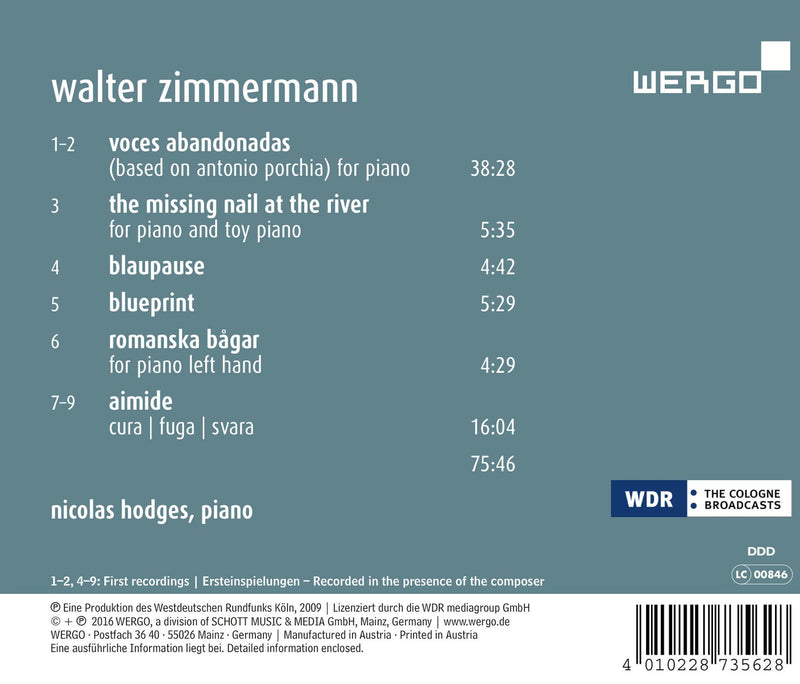 Walter Zimmermann’s music is often introverted and sometimes broodingly hesitant, but it is also enigmatically intimate; turbulent atmospheres, large gestures, and emphatic...