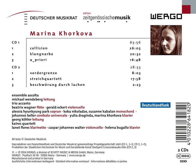 In this portrait, the composer Marina Khorkova forms multilayered soundscapes full of contrasts from a wide range of multiphonics and noises. The...