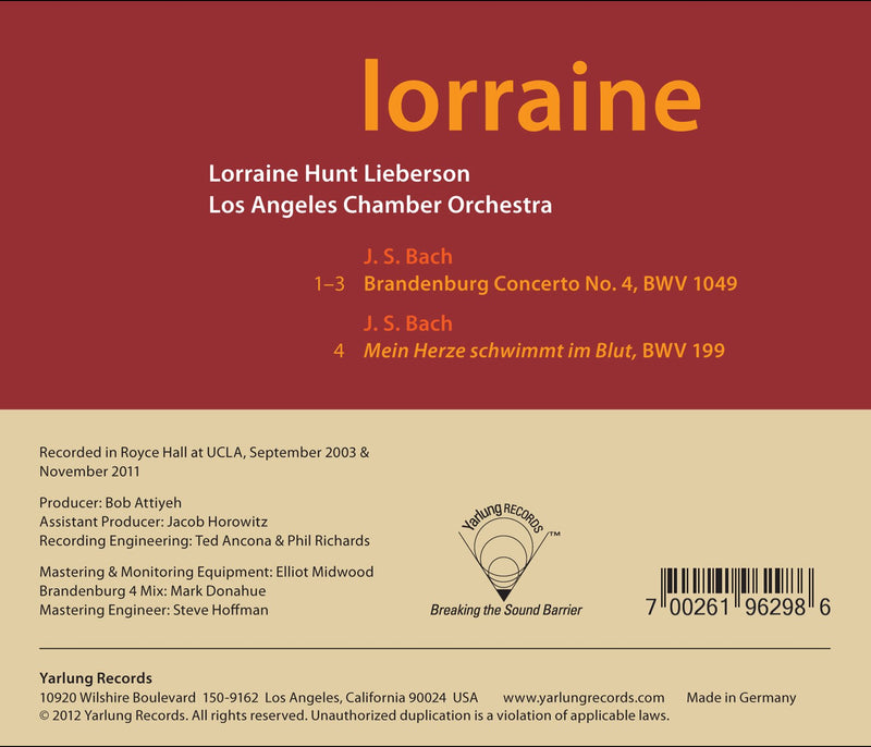 Yarlung RecordsLorraine - Bach: Mein Herze Schwimmt Im Blut / Hunt Lieberson, Los Angeles Chamber Orchestra